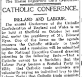 The relationship between organised labour and the Catholic Church was not harmonious in early 20th century Britain and Ireland. The Catholic Church had condemned the workers of the 1913 Dublin lock-out, and Jim Larkin in particular, as socialist revolutionaries. By 1921 the Catholic Church’s position had not changed much. This Cork Examiner (now Irish Examiner) article reported on the agenda being set for the annual Conference of the Catholic Confederation of England and Wales, where Catholics were discouraged from paying their dues to trade unions if they were affiliated with the “Socialist International”. The article also highlighted the Confederation’s denial that any future Irish state would be “governed and guided” by the Catholic Church.