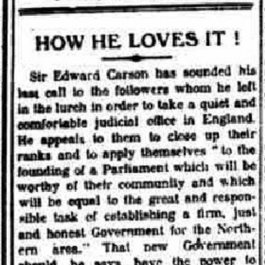 Sir Edward Carson’s love of liberty so far possesses his soul that he would do all in his power to ensure that priceless possession for all, excepting only the minority in the partitioned area and the nine-tenths of the population in the rest of Ireland.