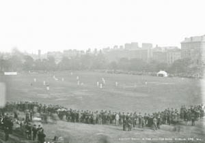 A cricket match was being played in the College Park, between the Gentlemen of Ireland and the Military of Ireland, in aid of Warriors’ Day. In view of the attractiveness of the match and of the good cause for which it was organised, there was a large attendance of spectators.