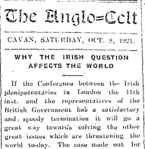 If the First World War marked the height of British Imperial power, Ireland’s treaty negotiations in 1921 could be seen as part of the empire’s decline. A colonial state rebelling against their London government (either by force or non-violent protest) and subsequently gaining a form of independence became a relative staple of the British colonial experience from the 1920s onwards. Some publications saw the writing on the wall as the negotiations for Irish independence were about to take place. In this editorial, the Anglo-Celt ponders the potentially far-reaching implications should Ireland successfully detach itself from the British Empire. Interestingly, it considers the possibility of a settlement a likely boon to Britain’s reputation, economy and international diplomacy.