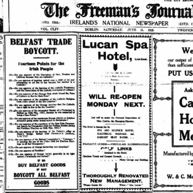 In August 1920 Dáil Éireann ordered a boycott of Belfast goods and a withdrawal of funds from the city’s banks in support of Catholic workers expelled from the shipyards. A Department of Boycott was created in 1921 and hundreds of local boycott committees were established across Ireland. Firms breaking the boycott were fined and the IRA carried out its own boycott patrols. This notice, printed in the Freeman’s Journal, shows how Nationalists encouraged Irish citizens to support the action. The boycott officially ended in January 1922 with the announcement of the first agreement between James Craig and Michael Collins, when Craig promised to aid the return of the expelled Catholic workers.