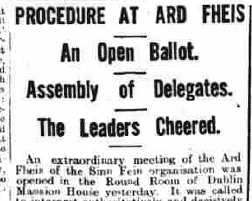 An extraordinary meeting of the Art Fheis of the Sinn Féin organisation was opened in the Round Room of Dublin Mansion House yesterday. It was called to interpret authoritatively and decisively the constitutions of the organisation, with special reference to the situation created by the signing of articles of agreement in London, and their approval by Dáil Éireann, so as to decide the policy of the organisation in view of the possible forth-coming election.