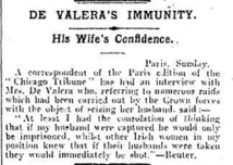 A correspondent of the Paris edition of the “Chicago Tribune” has had an interview with Mrs. De Valera who, referring to numerous raids which had been carried out by the Crown forces with the object of seizing her husband, said:- “At least I had the consolation of thinking that if my husband were captured he would only be imprisoned, whilst other Irish women in my position knew that if their husbands were taken they would immediately be shot.” – Reuters